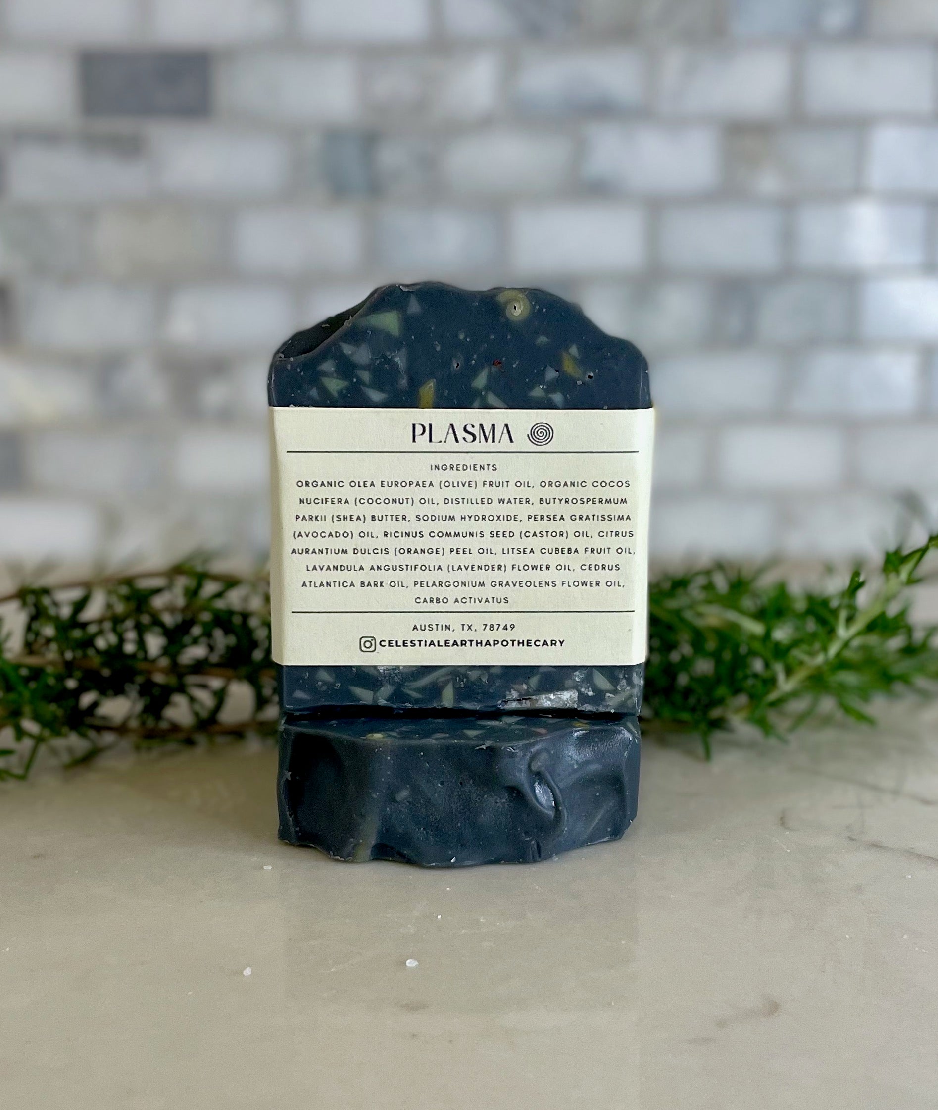 Meet PLASMA. The wild card of the elements, PLASMA is pure charged potential—the spark that forms when energy becomes matter. Crafted from the off-cuts of every soap in the Celestial Earth Apothecary line, each bar captures a moment of alchemy: swirling fragments suspended in a deep midnight-black base, creating a cosmic, electric landscape that never repeats itself.