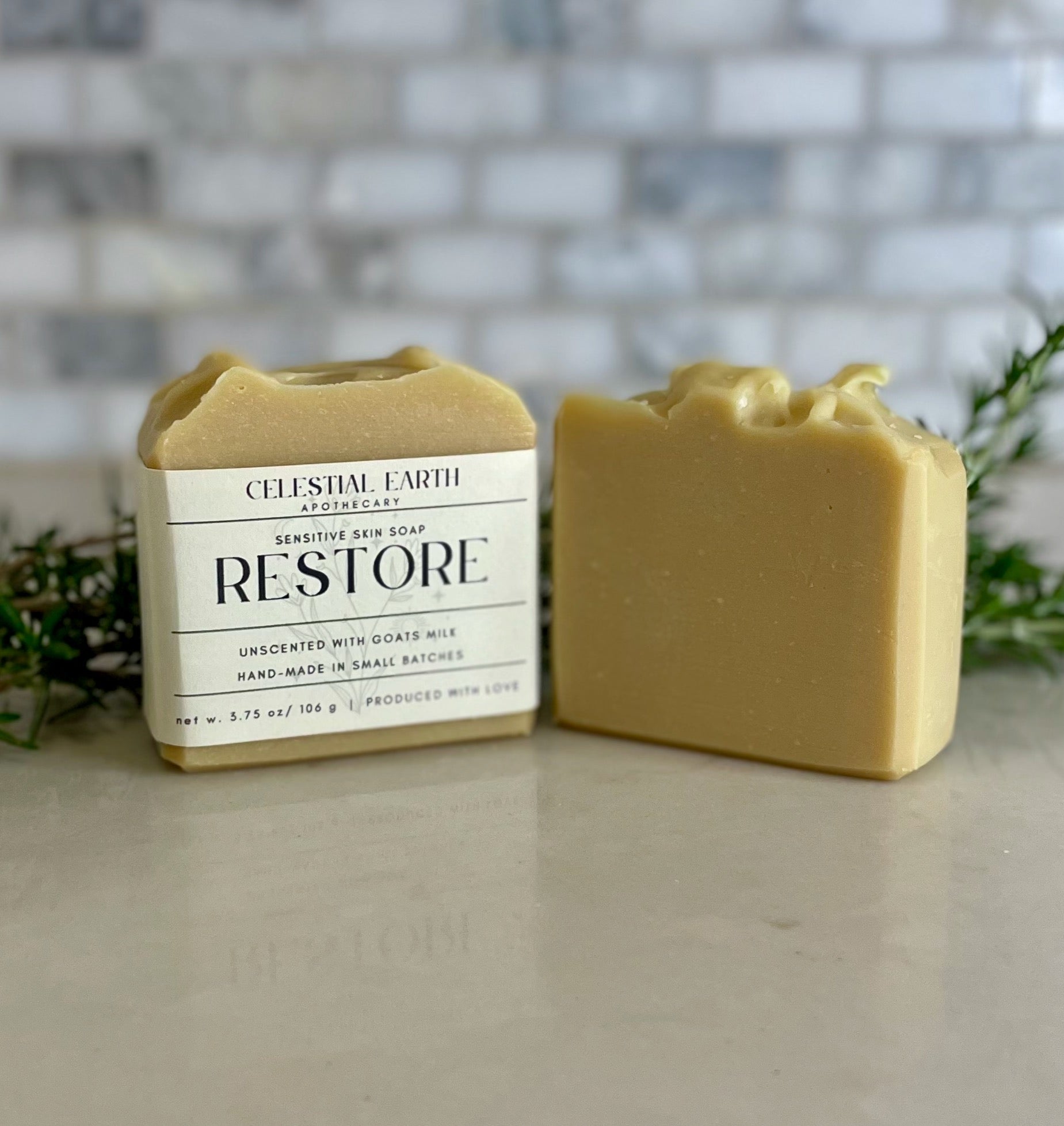 Gentle enough for the most sensitive skin, Restore is an unscented, additive-free soap that nurtures and protects. Crafted with olive oil, coconut oil, shea butter, and castor oil, this bar cleanses softly without stripping the skin’s natural barrier. Goat’s milk adds rich creaminess and lasting hydration, making this bar perfect for babies, families, and anyone seeking minimalist skincare.